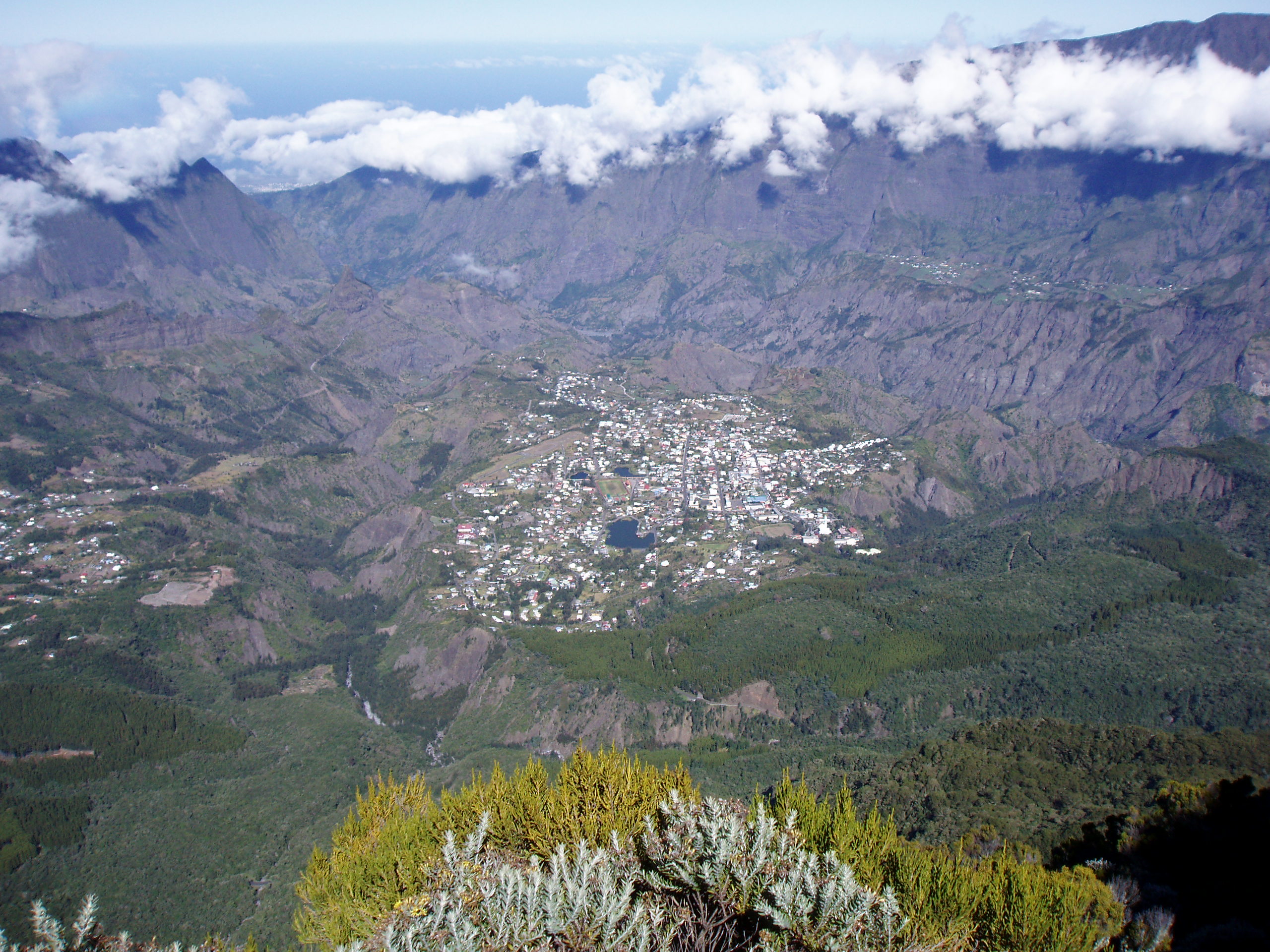 Après dissipation des nuages, voilà ce qu’on peut voir depuis le refuge : le Piton des Neiges et le cirque de Cilaos (avec l’Océan Indien au fond).
